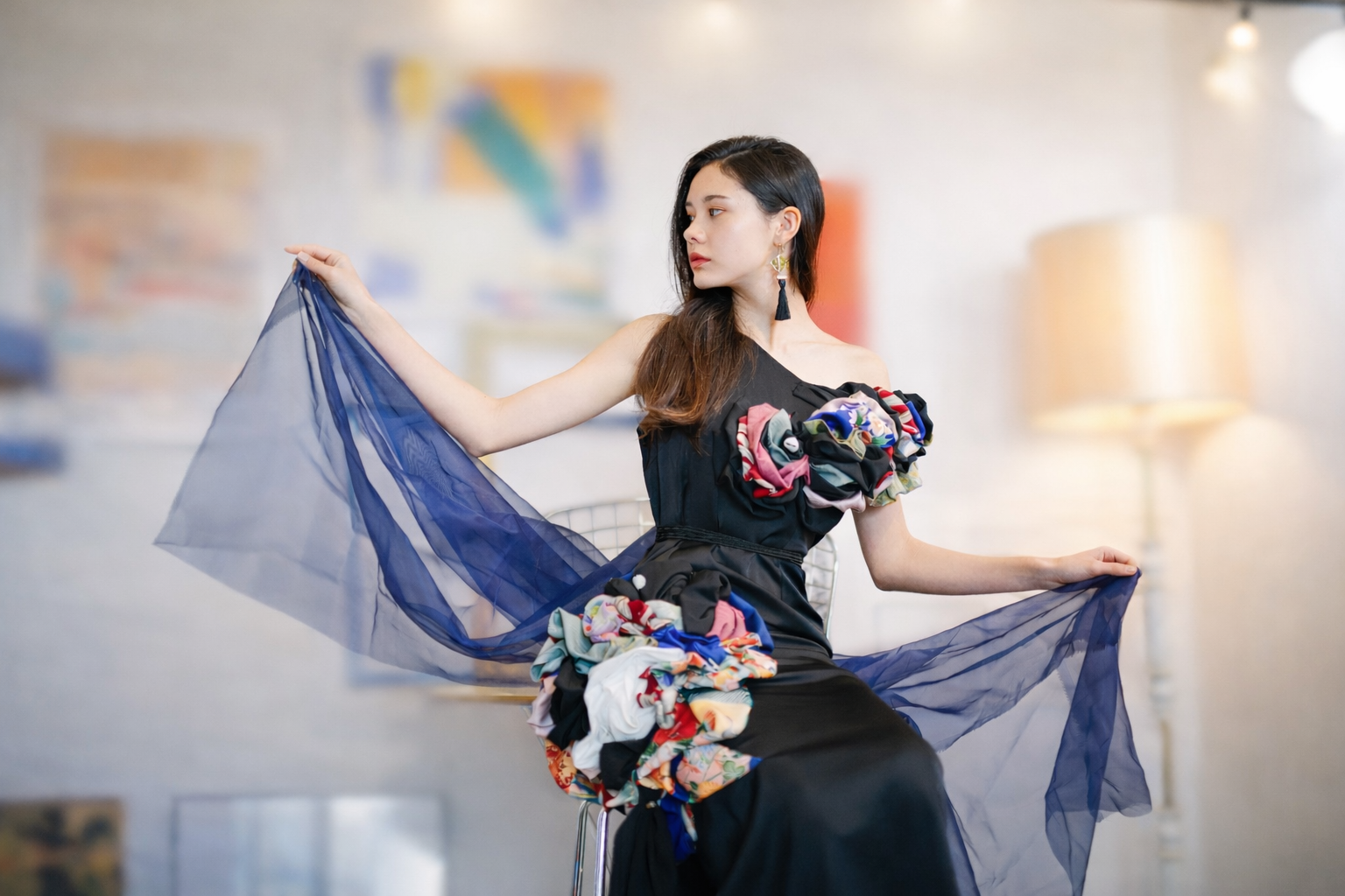 寺院や神輿に使われる金メッキ仕上げの装飾用金具と、廃棄寸前で集められた帯揚げで構成されるアクセサリーです。金具には2Dと、3Dがあり、さまざまなカラーの帯揚げからお選びいただけます。