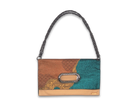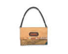 このバッグは異なった柄の帯を合わせて使っており、8通りの持ち方が可能です。チェーンを付ければ肩掛けや斜め掛けが可能で、チェーンを取り外せばクラッチとして使えるほか、折り畳まずに持ち手を持って使うこともできます。