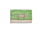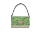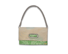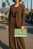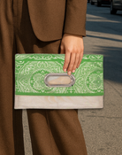 このバッグは異なった柄の帯を合わせて使っており、8通りの持ち方が可能です。チェーンを付ければ肩掛けや斜め掛けが可能で、チェーンを取り外せばクラッチとして使えるほか、折り畳まずに持ち手を持って使うこともできます。