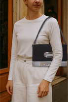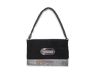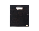 このバッグは異なった柄の帯を合わせて使っており、8通りの持ち方が可能です。チェーンを付ければ肩掛けや斜め掛けが可能で、チェーンを取り外せばクラッチとして使えるほか、折り畳まずに持ち手を持って使うこともできます。