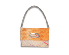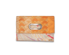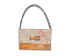 このバッグは異なった柄の帯を合わせて使っており、8通りの持ち方が可能です。チェーンを付ければ肩掛けや斜め掛けが可能で、チェーンを取り外せばクラッチとして使えるほか、折り畳まずに持ち手を持って使うこともできます。