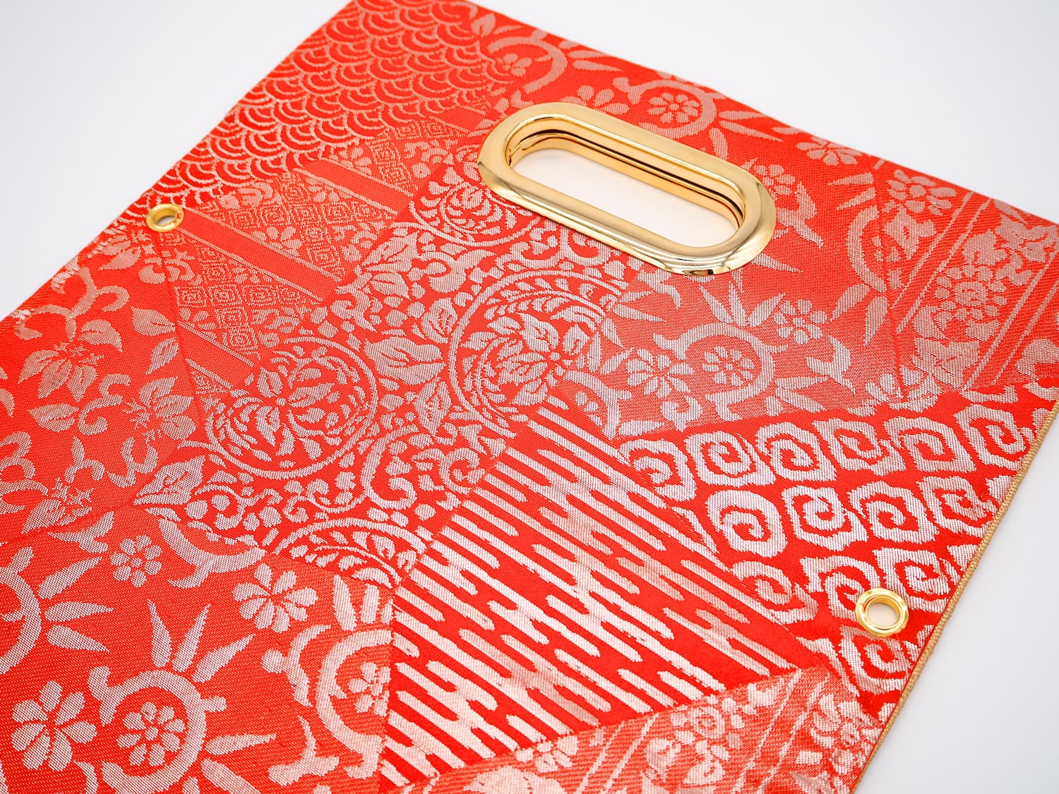着物の帯で作られているので、使っている場所によって柄が異なり、全てのバッグが一点ものとなっています。