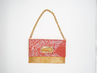 このバッグは異なった柄の帯を合わせて使っており、8通りの持ち方が可能です。チェーンを付ければ肩掛けや斜め掛けが可能で、チェーンを取り外せばクラッチとして使えるほか、折り畳まずに持ち手を持って使うこともできます。