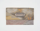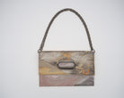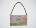 このバッグは異なった柄の帯を合わせて使っており、8通りの持ち方が可能です。チェーンを付ければ肩掛けや斜め掛けが可能で、チェーンを取り外せばクラッチとして使えるほか、折り畳まずに持ち手を持って使うこともできます。