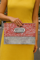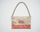 このバッグは異なった柄の帯を合わせて使っており、8通りの持ち方が可能です。チェーンを付ければ肩掛けや斜め掛けが可能で、チェーンを取り外せばクラッチとして使えるほか、折り畳まずに持ち手を持って使うこともできます。