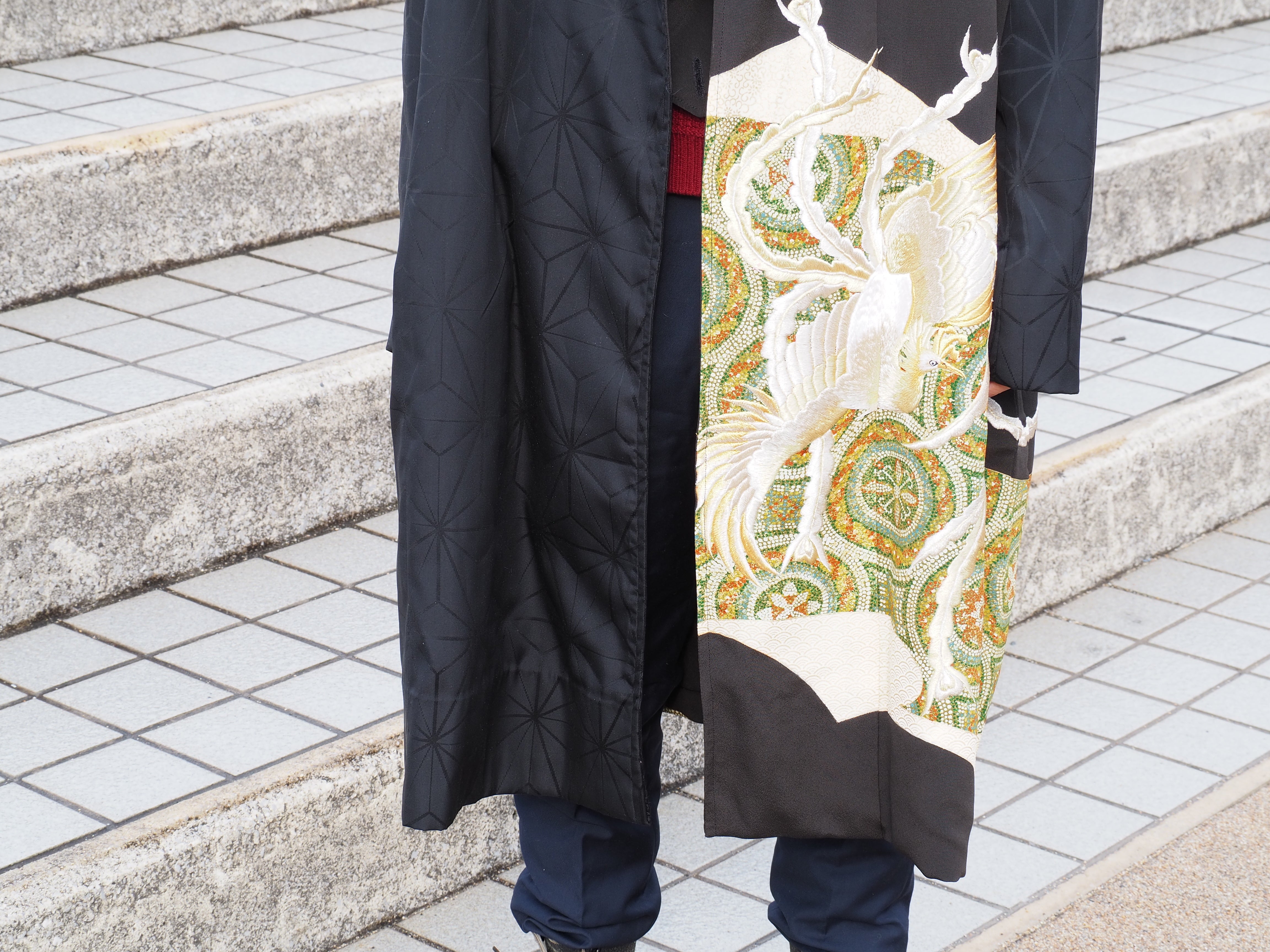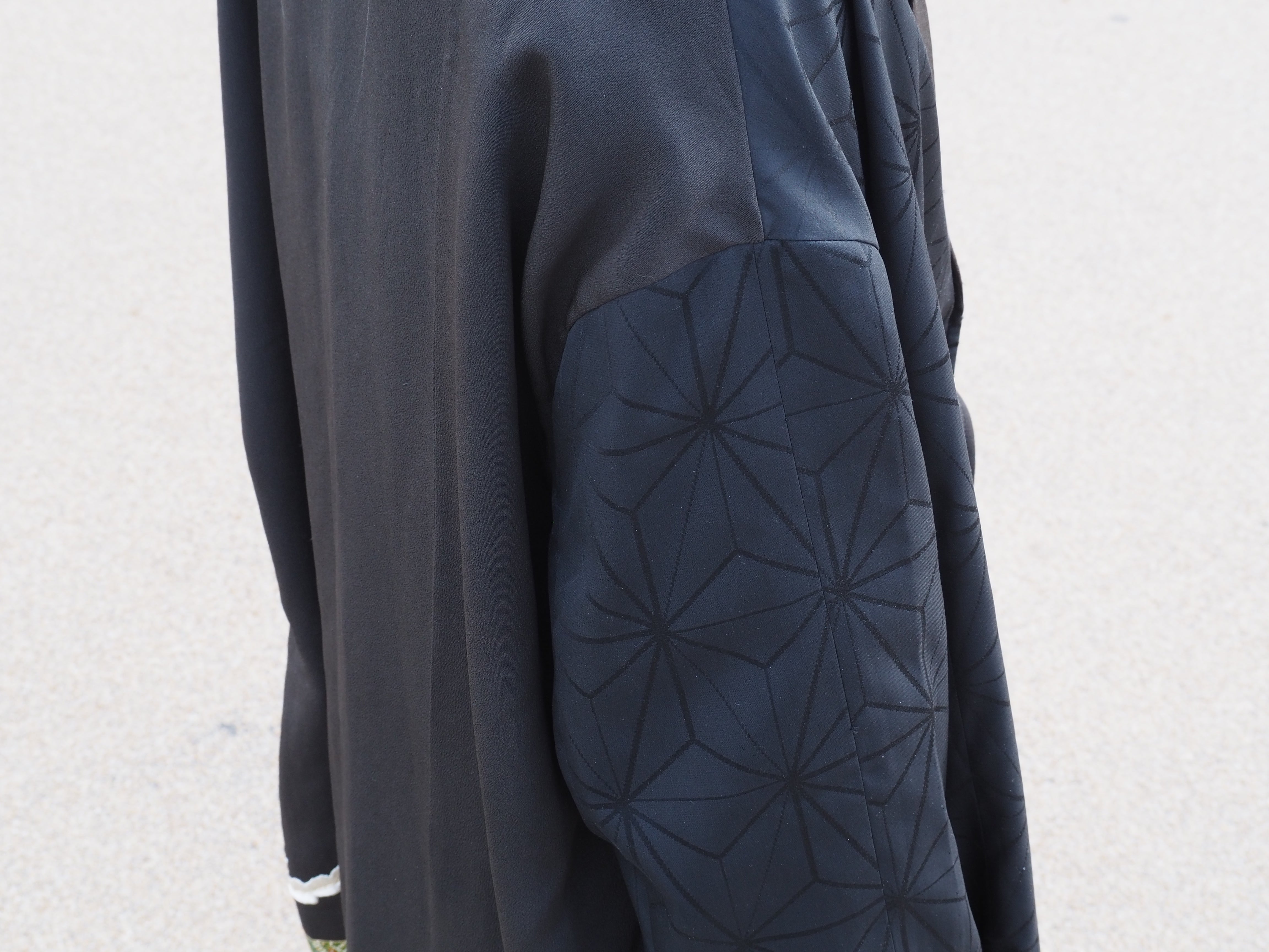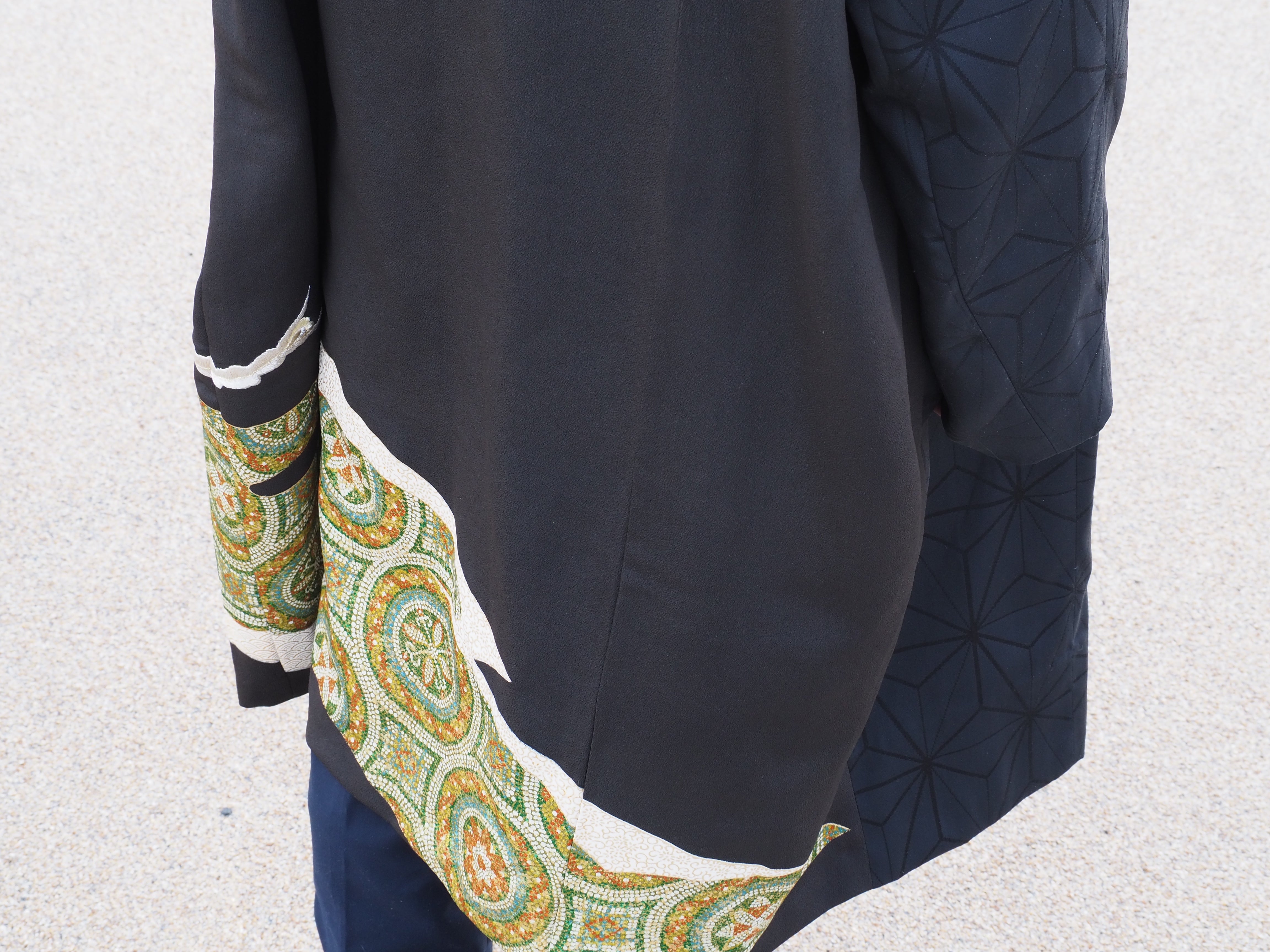 KIMONO JACKETは、2枚の着物から制作しています。美しい刺繍の施された黒留袖、全体に麻模様の入った着物、もともと柄と柄を重ねる想定で製作されている着物生地は、2種類を対にしても非常にバランスの良い仕上がりになります。着物の持ち込みも、弊社在庫からもご提案させていただけます。